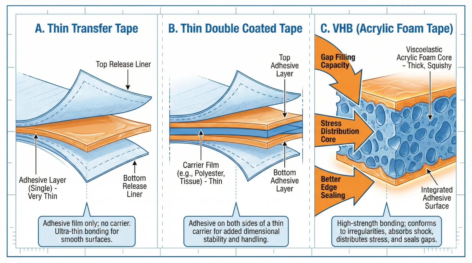 - What’s structurally different between thin double coated/transfer tapes and VHB-type acrylic foam tapes—and why that matters
